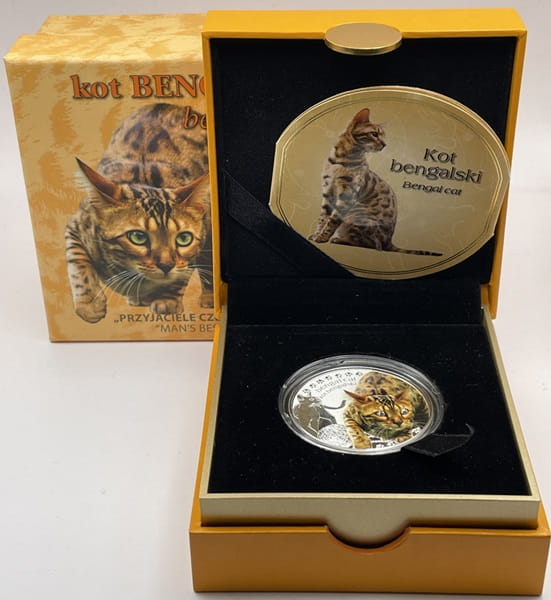 1 dolar Kot bengalski 2014 r. - srebrna moneta kolekcjonerska, producent Mennica Polska S.A. na zlecenie Centralnego Banku Nowej Zelandii, stempel lustrzany, moneta w kapslu ochronnym, pudełku szkatułkowym i certyfikatem oraz dodatkowym ozdobnym pudełku kartonowym. Zdobiona drukiem cyfrowym, w oczach kota kryształki Swarovski Elements, stan zachowania menniczy