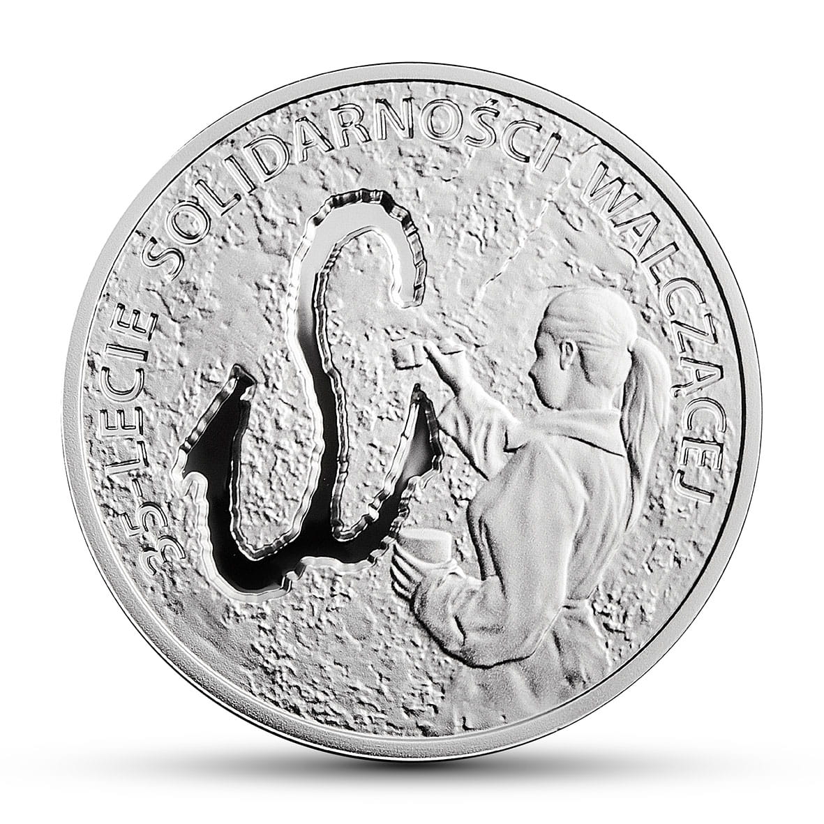 Solidarność Walcząca była największą organizacją dążącą do obalenia ustroju komunistycznego i przywrócenia niepodległości krajów zniewolonych przez imperializm sowiecki. Powstała we Wrocławiu w czerwcu 1982 roku i w krótkim czasie zbudowała struktury we wszystkich regionach i wszystkich większych miastach Polski. Już w 1983 roku SW rozpoczęła druk wydawnictw drugiego obiegu w języku czeskim i rosyjskim, a uformowany następnie Wydział Wschodni tej organizacji współtworzył ośrodki walki o wolność na terenie kilku republik Związku Sowieckiego. Było to jedyne środowisko opozycyjne, przeciw któremu minister spraw wewnętrznych PRL, gen. Czesław Kiszczak, wydał rozkaz „użycia wszystkich dostępnych sił i środków”. Pomimo zaangażowania cywilnych i wojskowych służb specjalnych, zwalczania Solidarności Walczącej przez jednostki KGB i STASI oraz licznych i częstych aresztowań osób związanych z organizacją, nigdy nie została ona rozbita ani spenetrowana przez agenturę. Solidarność Walcząca składała się z około trzech tysięcy zaprzysiężonych działaczy, wspieranych przez wielokrotnie większą liczbę osób czynnie ich wspomagających. Wydawała ponad sto tytułów podziemnej prasy, jej sieć podziemnych radiostacji w kilkudziesięciu miastach Polski wyemitowała kilkaset nielegalnych audycji. Miała, dbające o bezpieczeństwo pracy konspiracyjnej, własne struktury kontrwywiadu. Każdy członek Solidarności Walczącej był nie tylko konspiratorem szkolonym w tym rzemiośle na podziemnych kursach, drukarzem znającym różne techniki poligraficzne, ale też „chodzącą jednoosobową drukarnią”, czyli osobą zdolną samodzielnie uruchomić powielanie podziemnej prasy w najbardziej niesprzyjających okoliczno- ściach i w warunkach minimalnej ilości środków. Wśród działaczy Solidarności Walczącej dużą część stanowiły kobiety, odgrywające w organizacji ogromną rolę i wykazujące się nadzwyczajną ofiarnością. Jednym z wielu przykładów ich zaangażowania mogą być „Wiadomości Bieżące” – konspiracyjne pismo, zawdzięczające swe istnienie głównie inicjatywie kobiet. Ukazywało się przez 8 lat w kilkutysięcznych nakładach, w sumie wydano 242 numery. Funkcjonowało, jak wiele innych wydawnictw Solidarności Walczącej, dzięki rozległym sieciom podziemnych punktów poligraficznych i kolportażowych. Struktura ta była zarazem wielką szkołą praktycznych umiejętności, służących łamaniu państwowego monopolu informacji. Jedna z liderek tej szkoły – Barbara Sarapuk – zyskała miano „Królowej Podziemnego Druku”, wyszkoliła bowiem największą rzeszę drukarzy w całym ruchu wydawnictw drugiego obiegu. Symbolika zawarta na awersie monety przypomina, że to nasz kraj w zasadniczy sposób przyczynił się do skruszenia betonowego muru komunistycznego zniewolenia i odegrał fundamentalną rolę w obaleniu porządku jałtań- skiego. Na awersie widać bowiem pękający, rozsadzany godłem polskiego państwa, monolit. W jego pęknięciach umieszczono słowa z programu oraz roty przysięgi, jaką składali członkowie Solidarności Walczącej. Z kolei rewers przedstawia stylizowaną sylwetkę kobiety malującej znak tej organizacji. Kornel Morawiecki – założyciel Solidarności Walczącej