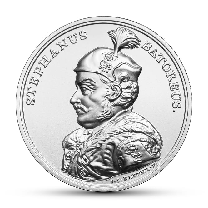 Stefan Batory (1576–1586) Piętnasta moneta serii przedstawia Stefana Batorego (Báthory István), syna wojewody siedmiogrodzkiego, od 1571 r. księcia Siedmiogrodu, 15 grudnia 1575 r. okrzykniętego przez szlachtę królem polskim. 1 maja 1576 r. poślubił Annę Jagiellonkę, wybraną rok wcześniej na króla Polski, dzięki czemu zyskał prawo do tronu i został koronowany w Krakowie. Uznaje się go za jednego z wybitniejszych władców polskich. Na rewersie monety widnieje odwzorowane z medalu popiersie króla (według obrazu pędzla Marcella Bacciarellego) profilem w lewo, z wąsami, w magierce z kitą, w żupanie i w delii z futrzanym kołnierzem i guzami, spiętej okrągłą agrafą. Na awersie monety czytamy nieznacznie skrócony tekst z rewersu medalu (w tłumaczeniu): Książę Siedmiogrodu, królewny Anny Jagiellonki małżonek, wybrany na króla Roku Pańskiego 1575 dnia 15 grudnia, koronowany w roku następnym dnia 30 maja, Gdańszczan zmusił do posłuszeństwa, Połock, Witebsk i Inflanty orężem przywrócił Rzeczypospolitej, ustanowił trybunały, założył Akademię Wileńską, sprawiedliwy, waleczny, wykształcony, przedwczesną śmiercią porwany w Grodnie Roku Pańskiego 1586, w 54. roku życia, w 11. roku panowania, dnia 12 grudnia. Stefan Batory urodził się w 1533 r. Otrzymał staranne wykształcenie w Austrii, na dworze Habsburgów, i we Włoszech. Na Węgrzech brał udział w walkach przeciwko okupującym kraj Turkom i Habsburgom. Jako władca Polski dążył do wzmocnienia władzy królewskiej. Po objęciu tronu zmusił do uległości stronników cesarza Maksymiliana II Habsburga, kontrkandydata do korony. W 1577 r. zwyciężył wojska najemne Gdańska, optującego za Habsburgiem. Gdańsk utrzymał jednak całkowitą autonomię za cenę uznania elekcji i przyznania królowi połowy opłat nakładanych na statki i towary, które trafiały do portu (cło palowe). Szczególne zasługi Batory położył w dziedzinie wojskowości, m.in. zorganizował piechotę wybraniecką. Przeprowadził zwycięskie kampanie przeciwko Moskwie, zdobywając Połock i Wielkie Łuki. Rozejmem w Jamie Zapolskim (1582) umocnił panowanie Rzeczypospolitej w Inflantach i rozszerzył granice Litwy. Planował stworzenie ligi antytureckiej, opartej na współdziałaniu państw europejskich, w celu wyzwolenia Węgier. W polityce wewnętrznej usprawnił system podatkowy i założył nowe mennice. Powołał też nowe Trybunały – Koronny (1578) i Litewski (1581). W 1579 r. utworzył Akademię w Wilnie. Cechowała go tolerancja religijna. Zmarł w 1586 r. Został pochowany na Wawelu, gdzie w kaplicy Mariackiej umieszczono jego nagrobek dłuta Santi Gucciego. Marta Męclewska