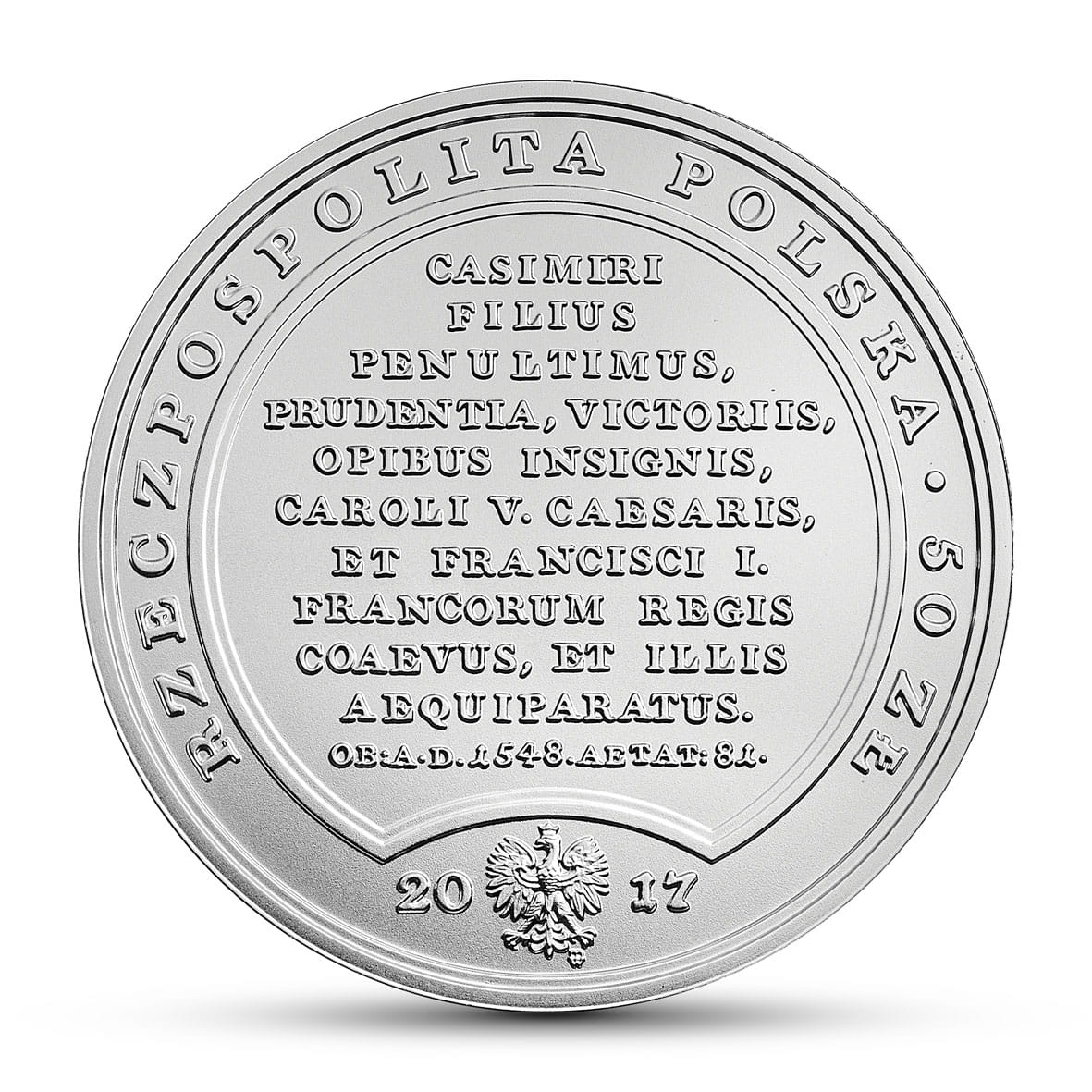 Dwunasta moneta serii przedstawia Zygmunta I, piątego syna Kazimierza Jagiellończyka i Elżbiety Rakuszanki, wielkiego księcia litewskiego i króla polskiego od 1506 r., po koronacji syna w 1529 r. nazwanego „Starym”. Był zwolennikiem pokojowego rozwiązywania sporów politycznych, ciesząc się szacunkiem wśród poddanych i wśród władców zagranicznych. Jego panowanie zapoczątkowało polski „złoty wiek” – okres gospodarczego i kulturalnego rozkwitu kraju. Na rewersie monety widnieje przeniesione z medalu popiersie króla (według obrazu Marcella Bacciarellego) zwrócone w prawo, w koronie na głowie, z krótką brodą nad rurkowaną krezą. Król nosi zbroję, nakrytą bogato haftowanym płaszczem, spiętym ozdobną klamrą, z klejnotem Orderu Złotego Runa na łańcuchu. Jest to pierwszy w serii medal wykonany przez Jana Jakuba Reichla, nowego nadwornego medaliera Stanisława Augusta (Jan Filip Holzhaeusser zmarł w 1792 r.). Na awersie monety czytamy nieznacznie skrócony tekst z rewersu medalu (w tłumaczeniu): Przedostatni syn Kazimierza, odznaczający się roztropnością, zwycięstwami i majątkiem, współczesny Karolowi V cesarzowi i Franciszkowi I królowi francuskiemu, i im równy. Umarł Roku Pańskiego 1548, mając lat 81, w 42. roku panowania, dnia 1 kwietnia. Zygmunt urodził się w 1467 r., żonaty z Barbarą Zapolya (1512) i Boną Sforza d’Aragona (1518). W latach 1499–1506 książę głogowski. Obrany królem Polski w grudniu 1506 r., koronowany w Krakowie w styczniu 1507 r. Uporządkował i wzmocnił skarbowość, cła i żupy solne. W 1515 r. zawarł sojusz z Habsburgami. W 1526 r. włączył do Korony lenno mazowieckie. Przeprowadził elekcję vivente rege syna, Zygmunta Augusta w 1529 r., niedługo potem ustanowił w Polsce elekcję viritim (wolną elekcję). W wyniku wojen 1507–1508 i 1512–1522 (mimo zwycięstwa pod Orszą w 1514 r.) Litwa utraciła na rzecz Moskwy Smoleńsk. Po wojnie z Krzyżakami (1519–1520) przyjął w 1525 r. hołd lenny Albrechta Hohenzollerna, księcia Prus (uprzednio wielkiego mistrza zakonu krzyżackiego). Zmodernizował system monetarny i zunifikował z nim pieniądz pruski (1526). Hojny mecenas sztuki renesansowej, przebudował Wawel. Zmarł w 1548 r., pochowany w Krakowie na Wawelu. Marta Męclewska