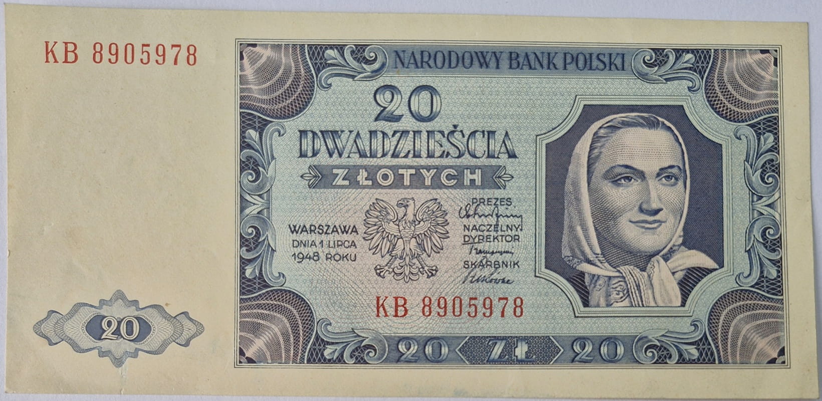 Banknot obiegowy PRL emitent Narodowy Bank Polski, Polska Rzeczpospolita Ludowa, producent PWPW w Warszawie, nominał 20 złotych materiał papier, wymiary banknotu 160 mm x 76 mm, rok emisji 1948, stan zachowania 2/+2, real foto