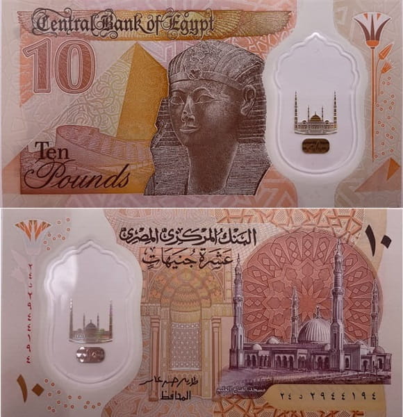 W prawym górnym rogu nominał banknotu 10. Na grafice banknotu przedstawiono meczet i uniwersytet Al Azhar, pod nim czarną czcionką seria banknotu i jej numer. Przy lewej krawędzi banknotu pionowo czerwoną czcionką seria i jej numer, a u dołu banknotu powtórzony jego nominał 10. Obok przeźroczyste pole a na nim hologramowy obraz oraz nominał banknotu 10
