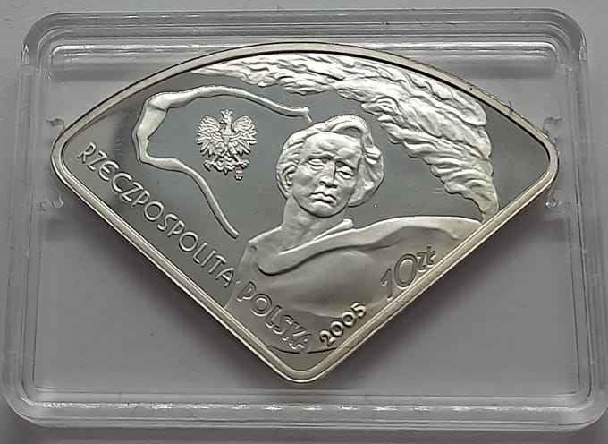Awers: Na awersie monety orzeł w koronie ustalony dla godła Rzeczypospolitej Polskiej, poniżej ukośnie w dół napis: RZECZPOSPOLITA POLSKA. Od dołu monety w górę rok emisji oraz nominał 10 zł W centralnej części monety fragment stylizowany pomnika Fryderyka Chopina w Warszawie - Łazienki Królewskie. Pod lewą łapą orła znak mennicy: m/w.