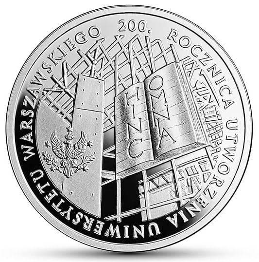 10 zł 200. rocznica utworzenia Uniwersytetu WarszawskiegoSrebrna moneta kolekcjonerska z kategorii monety 10 zł emitent NBP, producent Mennica Polska S.A. temat indywidualny, stempel lustrzany, stop / metal srebro Ag925, średnica 32 mm, waga / masa 14,14 gram, rok emisji 2016, nakład emisji 20 000 sztuk, projektant awersu i rewersu Dominika Karpińska-Kopiec, moneta w pudełku z certyfikatem, stan zachowania menniczy L/LAwers monetyNa awersie w jej górnej części orzeł w koronie, godło ustanowione dla Rzeczypospolitej Polskiej. Półkolem u góry monety napis: RZECZPOSPOLITA POLSKA oraz rok emisji monety 2016. U dołu monety jej nominał 10 zł. Z lewej strony monety litery UW. Pod orłem postument, a na nim napis: Dwa stulecia, dobry początek. Pod lewą łapą orła znak mennicy: m/wRewers monetyNa rewersie wokół rantu napis: 200. ROCZNICA UTWORZENIA WARSZAWSKIEGO UNIWERSYTETU WARSZAWSKIEGO. W centralnej części monety stylizowany fragment holu Biblioteki Uniwersyteckiej przy ul. Dobrej. Po prawej stronie monety otwarta księga, a na jej kartach napisy HINC OMNI (pol. stąd wszystko), zawierzona nad wejściem do uniwersyteckiej biblioteki. Z lewej strony monety godło uniwersytetu warszawskiego.Bok monetyGładki bok, bez napisówMoneta 200 rocznica utworzenia Uniwersytetu WarszawskiegoŹródło: Opracowanie własne