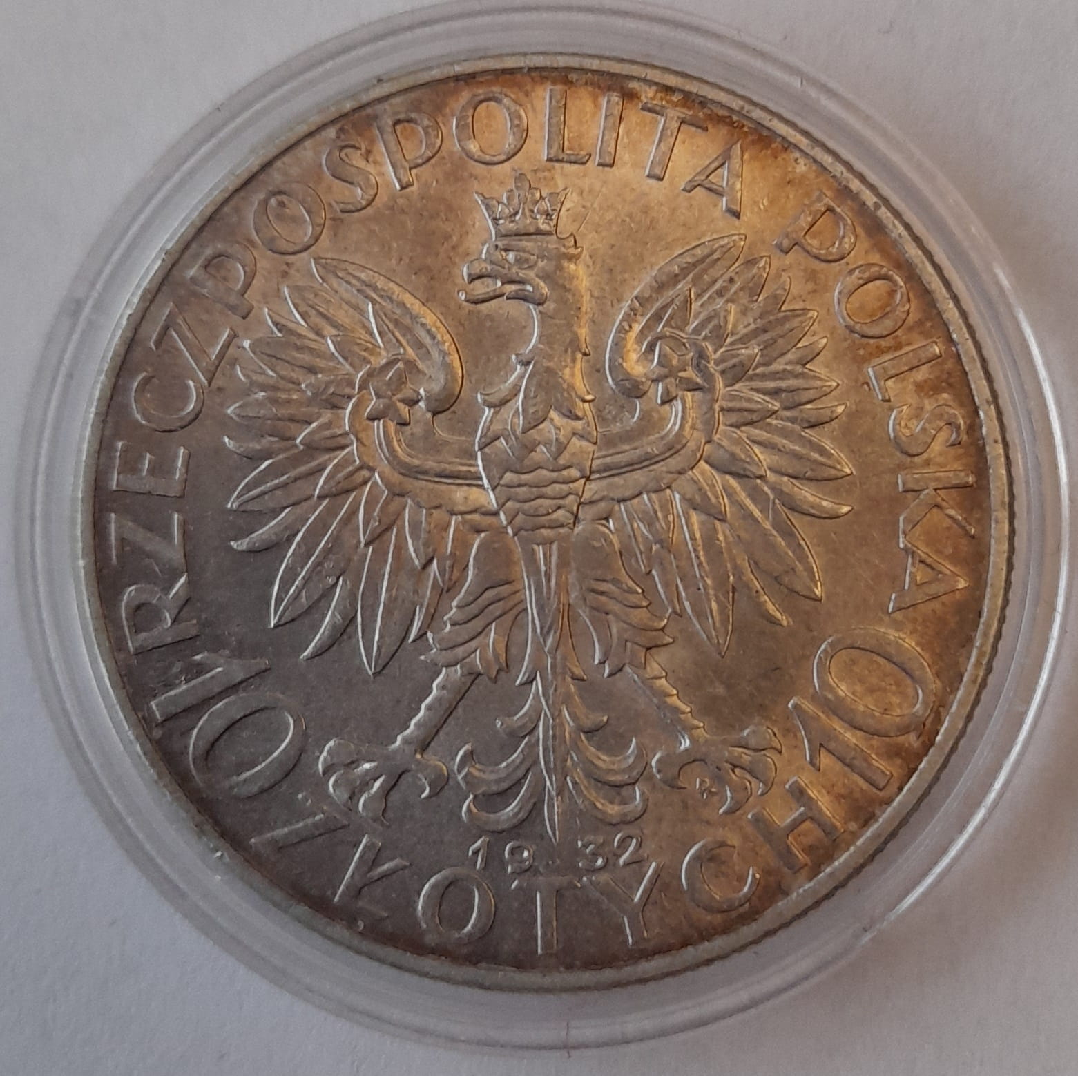 10 zł 1932 r. Głowa kobiety Polonia - srebrna moneta obiegowa okresu międzywojennego, stempel zwykły, moneta w kapslu ochronnym, stan zachowania -1, real foto