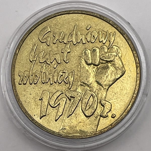 Na rewersie z prawej strony fragment przedramienia z zaciśniętą pięścią. Z lewej strony napis: Grudniowy / bunt / robotniczy / 1970 r.