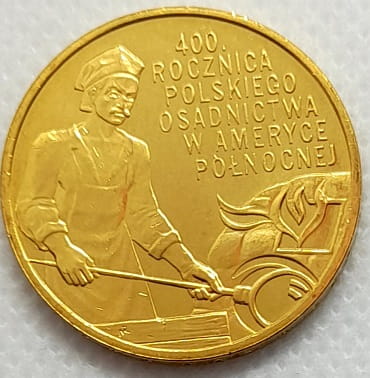 Z lewej strony monety stylizowany wizerunek mężczyzny wytapiającego naczynie szklane. Z prawej strony stylizowany wizerunek pieca do wytopu szkła, nad nim napis dużymi literami w kilku rzędach: 400./ rocznica / polskiego /osadnictwa / w Ameryce / północnej