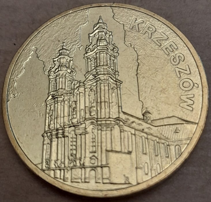 Na rewersie monety w centrum stylizowany wizerunek Bazyliki Wniebowzięcia Najświętszej Marii Panny w Krzeszowie. Po prawej stronie półkolem przy rancie monety napis: KRZESZÓW.