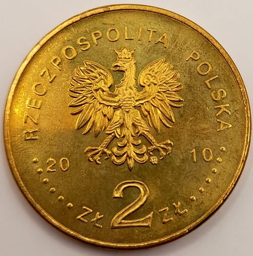 Na awersie monety widnieje orzeł w koronie ustanowiony dla godła Rzeczypospolitej Polskiej. Pod orłem rok emisji monety: 2010, poniżej nominał monety w zapisie: ZŁ 2 ZŁ. U góry półkolem napis dużymi literami: Rzeczpospolita Polska z obu stron oddzielony sześcioma koralikami od nominału monety. Pod lewą łapą orła znak mennicy: m/w