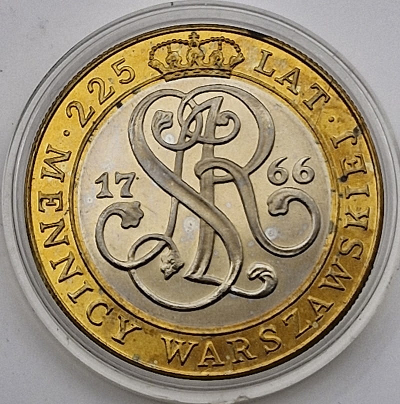Na rewersie inicjały Stanisława Augusta Poniatowskiego, które przedzielają rok emisji monety 17 / 66. U góry monety korona, a w otoku z dużymi literami: 225 Lat Mennicy Warszawskiej