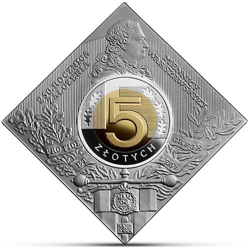 Na awersie w centralnym jak i na rewersie wtopiona w środek moneta obiegowa 5 złotych. Stylizowany zarys Zamku Królewskiego i postać Minerwy symbol opiekunka rzemiosła z medalu królewskiego z 1766 r. Pod lewą łapą orła znak mennicy: m/w