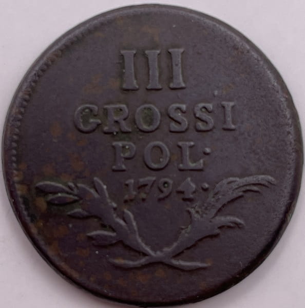 Od góry monety napis w trzech rzędach dużymi literami: III / Grossi / POL. Poniżej data emisji monety 1794. Pod nią dwie skrzyżowane gałązki