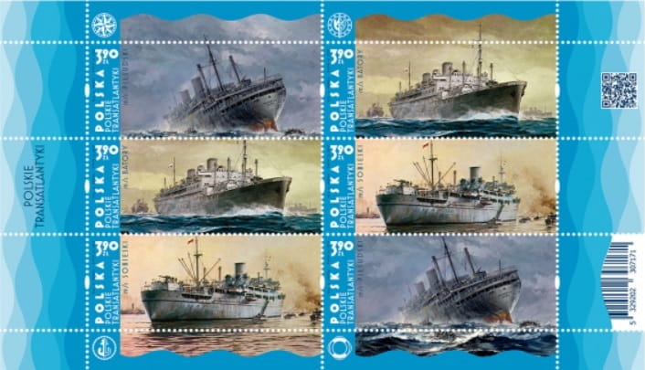 Polskie transatlantyki 2023 r. - arkusz znaczków kolekcjonerskich o ograniczonym nakładzie pojedynczego znaczka 120 000 szt. w formacie 76,50 mm x 31,25 mm, materiał papier fluorescencyjny, technika druku offsetowa. Arkusz 6 znaczków niestemplowany w układzie 2x3, perforowany, stan zachowania nowy