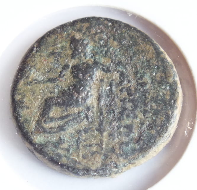 A: Zeus siedzący na tronie zwócony w lewo trzyma Nike